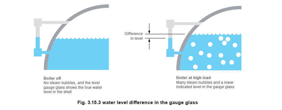 Não é possível definir o nível exato da água em uma caldeira a vapor, pois a superfície da água é constituída por uma massa de bolhas com forte circulação horizontal. Existem, portanto, variações de nível ao longo e ao longo do corpo da caldeira. Por outro lado, o vidro medidor contém água que: